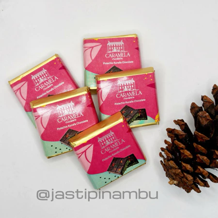Nikmati perpaduan mewah cokelat premium dengan pistachio pilihan dan kunafa renyah khas Timur Tengah dalam satu sajian istimewa. Caramela Chocolaterie Pistachio Kunafa Chocolate menghadirkan rasa manis yang seimbang, tekstur crunchy dari kunafa, serta gurih lembut pistachio yang memanjakan lidah.